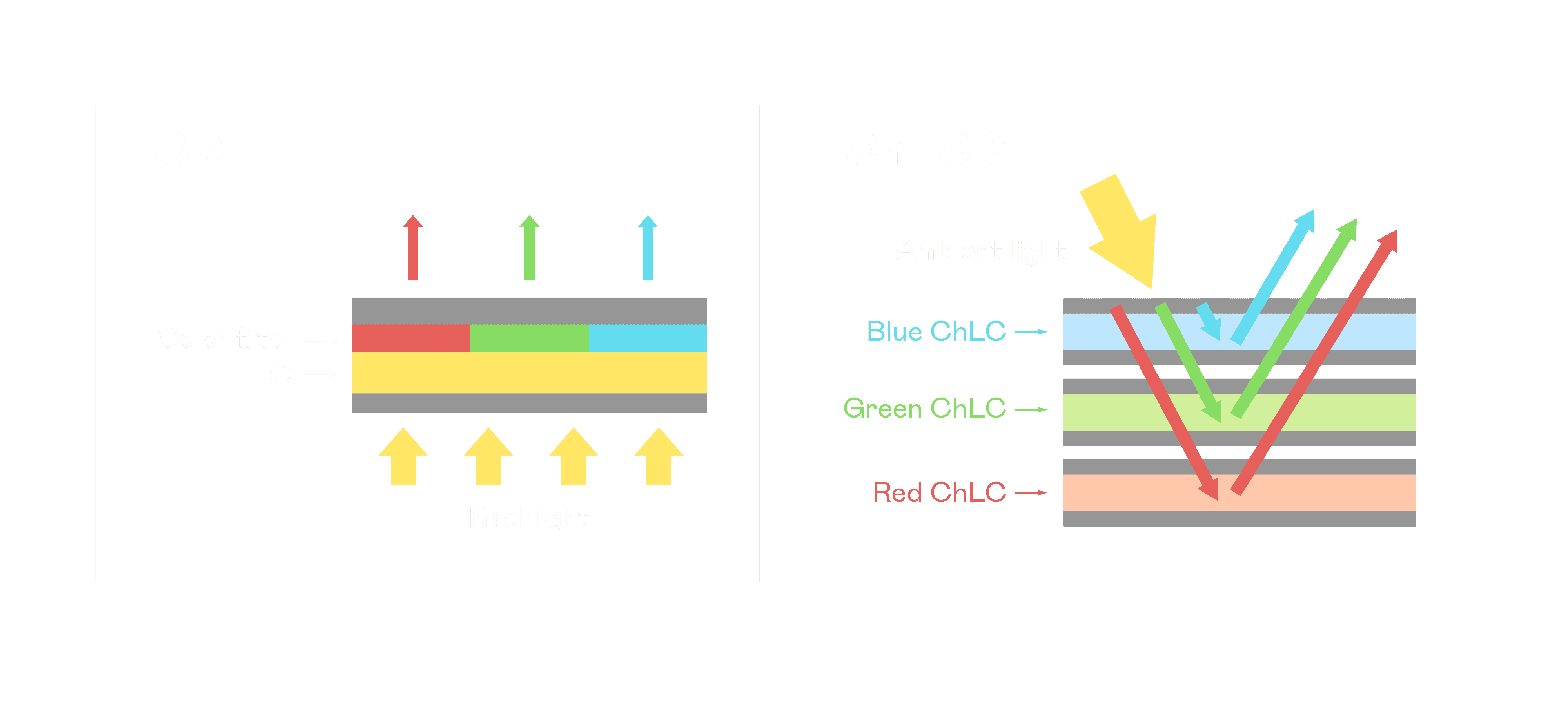 ChLCD 胆固醇液晶就如同纸张一样,,透过反射环境光来显示影像,,因此长时间观看不易造成人眼视觉疲劳,,可达到护眼效果。。当处于户外阳光下使用,,LCD 影像容易失真而不易观看,,,,但胆固醇液晶仍可维持较佳的影像品质。。。